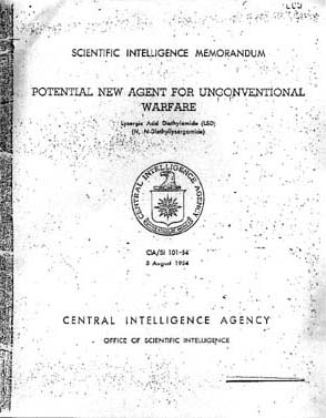 POTENTIAL NEW AGENT FOR UNCONVENTIAL WARFARE "Lysergic acid diethylamide (LSD), a drug derived from ergot, is of great strategic significance as a potential agent in unconventional warfare and interrogations. In effective doses, LSD is not lethal, nor does it have color, odor, or taste. It is capable of rendering whole groups of people, including military forces, indifferent to their surroundings and situations, interfering with planning and judgement, and even creating apprehension, uncontrollable confusion and terror. Of all substances now known to affect the mind, such as mescaline, harmine and others, LSD is by far the most potent. Very minute quantities (upwards of 30 millionths of a gram) create serious mental confusion and sensual disturbances, or render the mind temporarily susceptible to many types of influences. Administration of the drug produces in an individual such mental characteristics of schizophrenia as visual or auditory hallucinations and physiological reactions of dizziness, nausea, dilation of the pupils, and lachrymation. Data, although still very limited, are available which indicate its usefulness in eliciting true and accurate statements from subjects under its influence during interrogation. The basic material from which LSD is prepared is ergot and the Soviet Bloc has an abundant supply of it. The preparation of LSD has been published openly in considerable detail. Further, Sandoz Ltd., has made available free samples of it for clinical testing both in this country and in Europe. It is therefore assumed that this material is available to the Bloc inasmuch as no effective geographic limitation is known. |